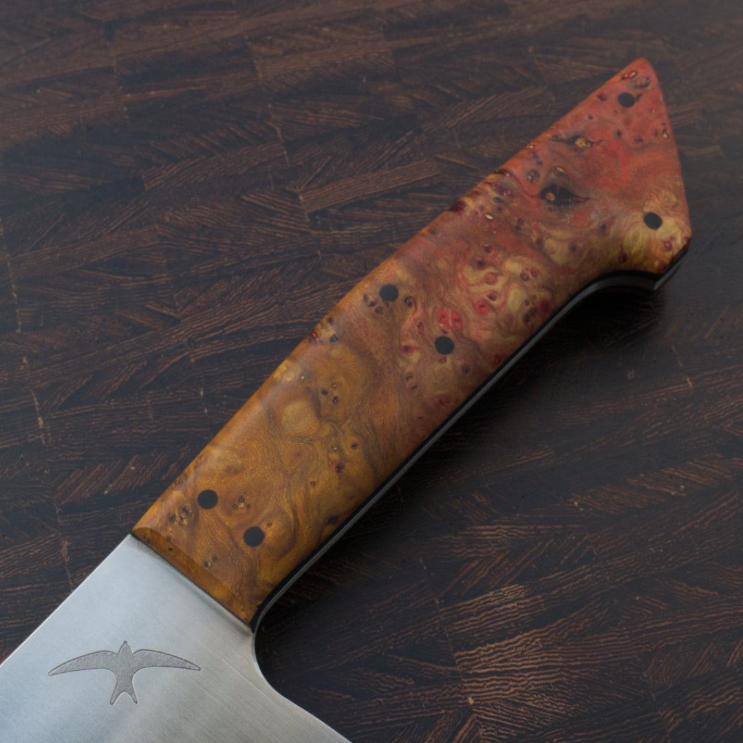 Burlwood is irregular patterning within a tree caused by stress or damage. It is recognisable for the unique swirls and intricate patterns. It is a popular choice for knife handles, though usually stabilised with the addition of a heat curing epoxy to improve strength and density. I stabilise most burlwood in-house, often with the addition of epoxy dyes making for some beautiful results.
