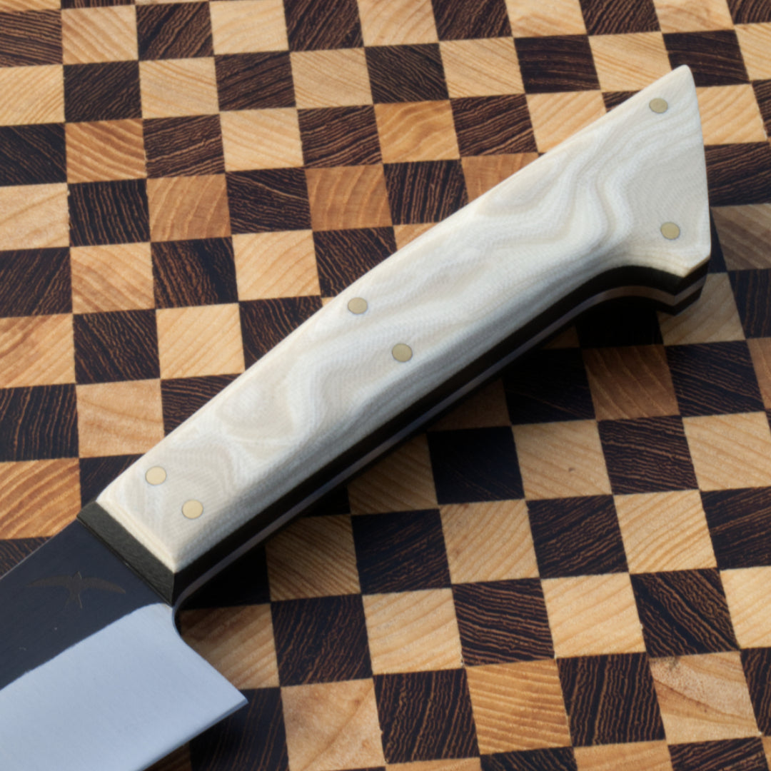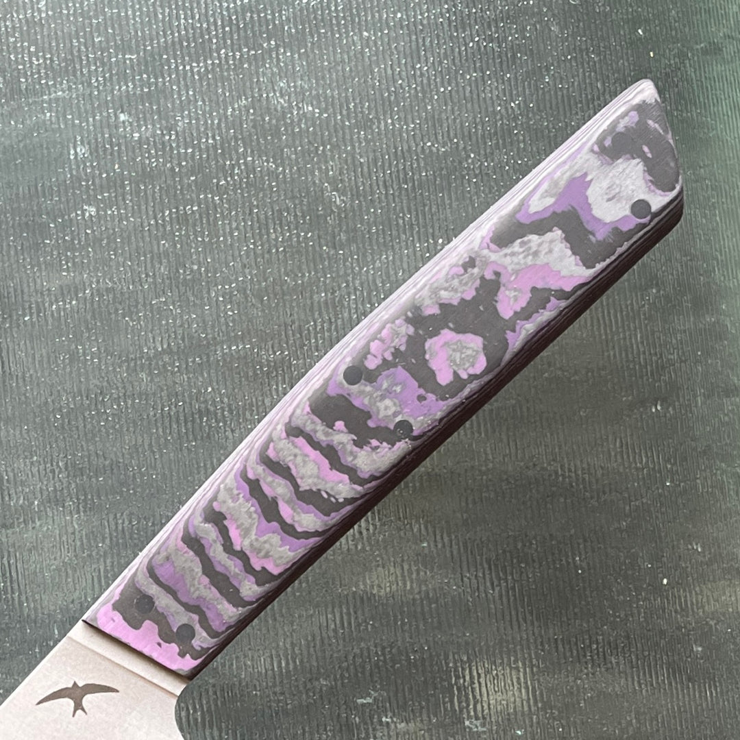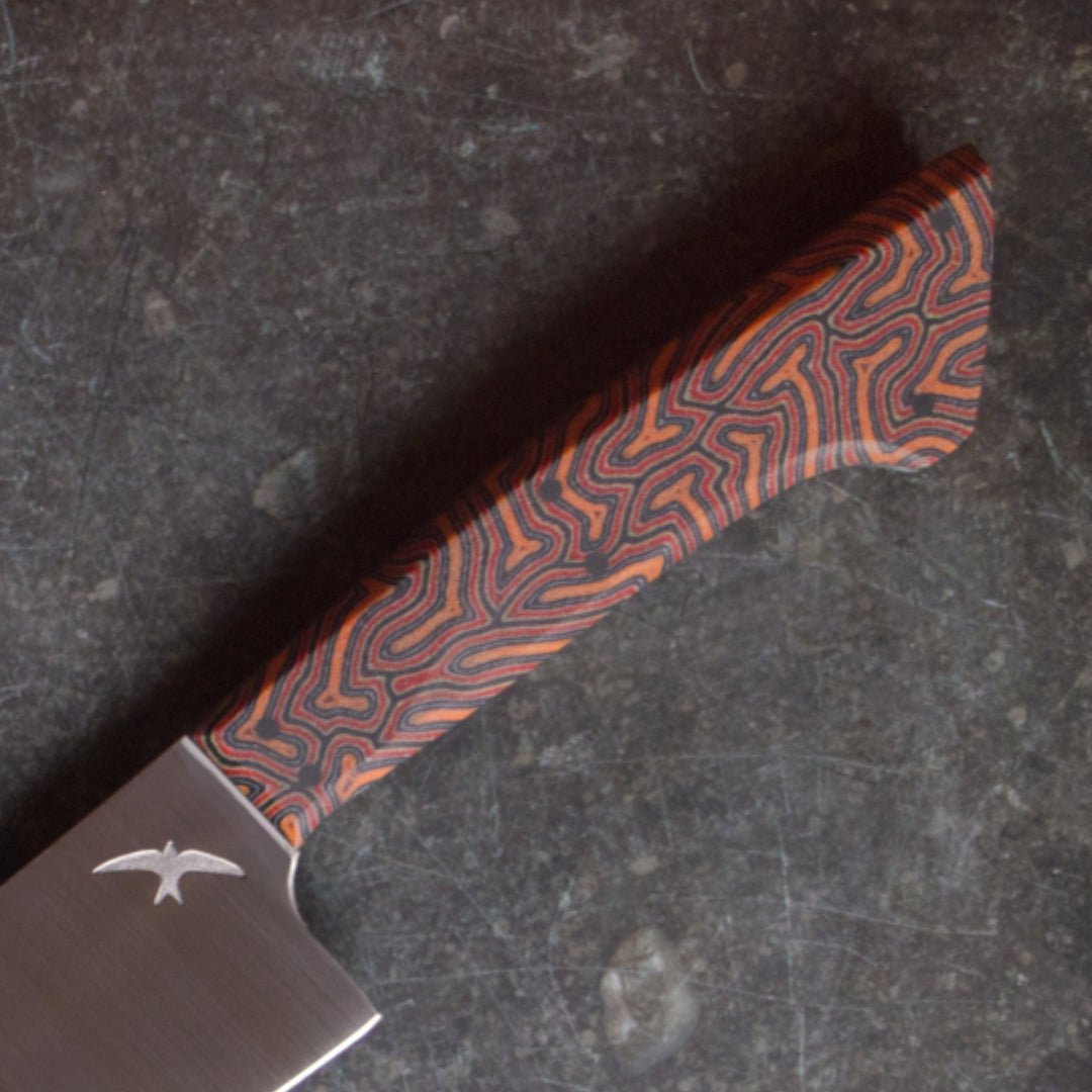 G10 or garolite is a composite material made from woven fibreglass cloth and a heat curing epoxy resin. It is impervious to moisture and a range of chemicals. It’s incredibly strong, stable and durable making it a great choice for kitchen knife handles. Traditionally it has uniform layers, but recently it had been made as burl, where the fibreglass is cut into small sections and laid randomly creating some interesting results.