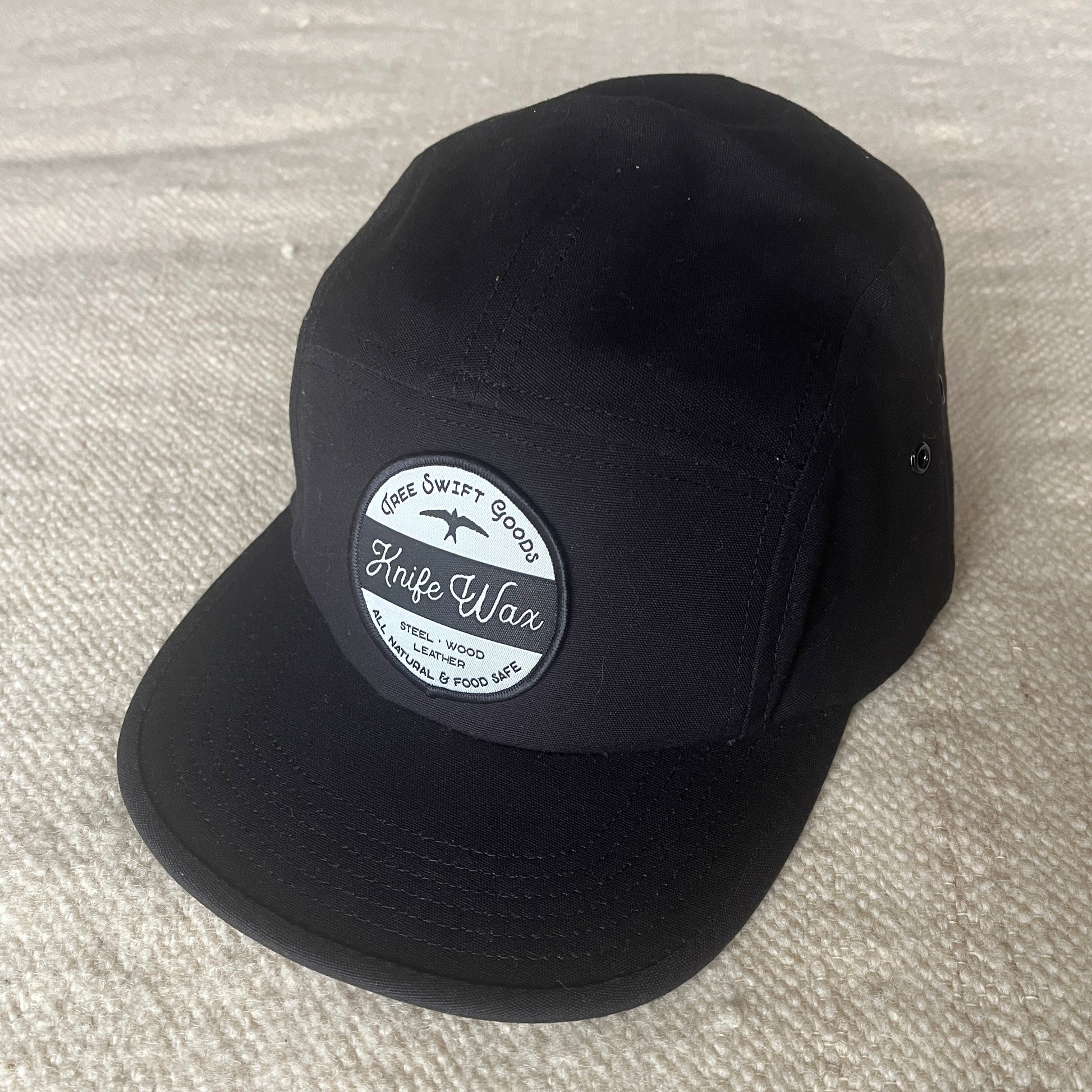 Cotton 5 panel cap with Knife Wax woven patch. Size adjustment on the back.